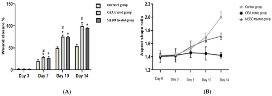 (A) Percentages of wound closure in all groups of the study (n = 6) with time after injury (0, 3, 7, 10, and 14 days). A two-way ANOVA test was performed to evaluate whether there was a significant difference between the groups. The data is presented as the mean ± SD. * p < 0.05 compared to the untreated group on the same day, and # p < 0.05 compared to the MEBO® group on the same day. (B) To clarify observed differences in the shape and direction of wound contraction between groups, the wound aspect ratio was calculated (length: width).