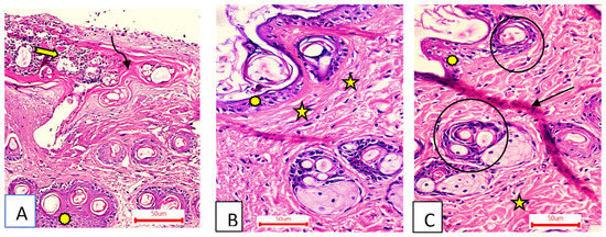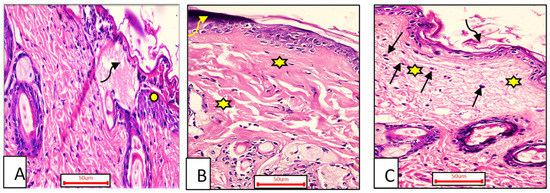 Group I (A) had a wide wound area (curved arrow), heavy inflammatory cellular infiltration in an acidophilic matrix (tailed arrow), and normal skin (asterisk). Group II (B) had an epidermis formed of 1–3 rows of epithelial cells (asterisk) and collagen fibers compactly arranged with prominent fibroblasts (stars). Group III (C) had typical epithelium, thin scar tissue extending into the dermis (black arrow), and reticular dermis with coarse, wavy collagen bundles arranged in different directions (star). Newly formed hair follicles (circles) (H&E stain ×200).