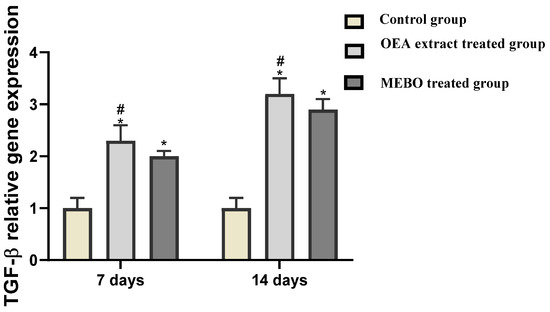 The relative expression expression of TGF-β in skin tissues was significantly statistically higher in OEA-treated injuries on the seventh and fourteenth days than in individuals from the control group (p < 0.05). Furthermore, OEA-treated wounds had considerable development in the expression of the marker compared to MEBO®-treated wounds (Figure 9).