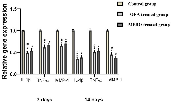 According to the analysis of mRNA levels on the seventh postinjury day, inflammatory mediators (IL-1β and TNF-α) as well as MMP-1 gene expression was dramatically downregulated in injuries treated with OEA or MEBO® comparing to control injuries (Figure 10). Wounds treated with OEA had a much more significant decrease in inflammatory markers (IL-1β and TNF-α) and MMP-1 than MEBO®-treated wounds. Furthermore, compared to control wounds, OEA or MEBO® therapy for fourteen days resulted in significantly lower TNF-α and IL-1β, MMP-1 relative gene expression (p < 0.05). Again, TNF-α, IL-1β, and MMP-1 expression were significantly lower in OEA-treated wounds than in MEBO®-treated wounds.