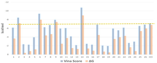 By carrying out docking against all protein structures saved in the PDB (https://www.rcsb.org/) (accessed on 1 March 2022), several suggested targets for the OEA-isolated molecules were putatively determined. In this analysis, small overlapping grids are adaptively built to constrain the searching space on protein surfaces, allowing them to run many accurate dockings runs in a shorter time [49]. The information was compiled as a ranking of binding affinity scores. We utilized a binding affinity score threshold of 7 kcal/mol to recognize the ideal receptors for each OEA-isolated molecule.