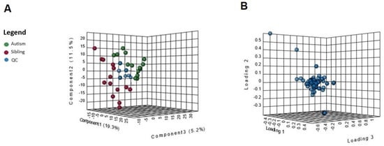 (A) Multivariate statistical analysis based on untargeted metabolite profile data derived from urine samples of ASD patients (red), typically-developing siblings (green) and quality controls (blue). Principal component analysis (PCA) in 3D based on normalized and mean-centered data of the 28 samples after outlier removal. Each sphere represents one sample. Axes are principal components 1 (x) and 2 (y), explaining 19.3% and 11.5% of the variation in the data, respectively. (B) Loading plots of the first two principal components for the platform metabolites.