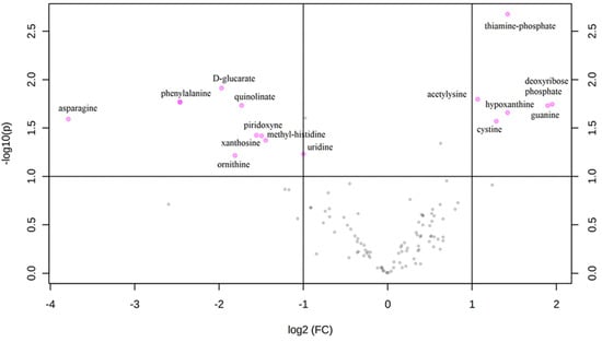 Volcano plot: each point on the volcano plot was based on both p-value and fold-change values, and in this study, these two values were set at 0.05 and 2.0, respectively. The points that satisfy the condition p < 0.05 and fold change > 2.0 appear in pink color and are marker candidates, whereas the others appear in gray and do not reach significance. On the x-axis, log2 (FC) is positive when ASD > SIB and negative when ASD < SIB, so pink dots on the right side of the figure represent metabolites significantly upregulated in autistic patients, and the pink dots on the left side represent the down-regulated metabolites. The x-axis corresponds to log2 (fold change), and the y-axis corresponds to –log10 (p-value).