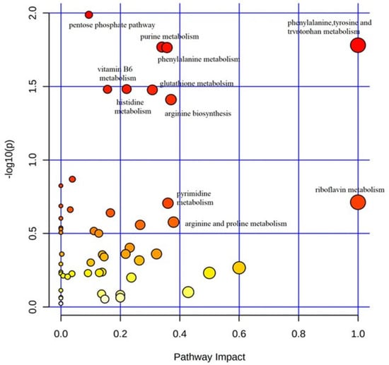 Metabolic pathway analysis plot. Color intensity (white to red) reflects increasing statistical significance, while circle diameter covaries with pathway impact. The graph was obtained by plotting on the y-axis the −log of p values from the pathway enrichment analysis and on the x-axis the pathway impact values derived from the pathway topology analysis. The metabolic pathways displaying the largest differences in ASD vs. typically-developing siblings mainly corresponded to “phenylalanine-tyrosine-and-tryptophan metabolism”, “phenylalanine metabolism”, “purine metabolism”, and “glutathione metabolism”.