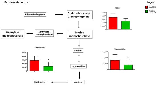 Figure 5 shows purine metabolism, in particular, hypoxanthine and xanthosine, significantly increased in ASD patients compared to typically-developing siblings, while inosine shows a non-significant decrease. Importantly, the release of these purine metabolites triggers the “cell danger metabolic response” involving mitochondrial dysfunction, microglial activation and neuroinflammation [35].
