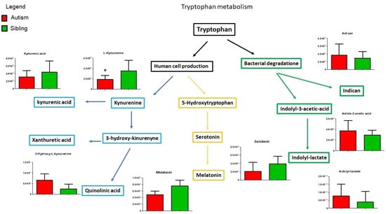 Given the recurrent involvement of tryptophan and purine metabolisms in autism spectrum disorder [24] and given the relevance of tryptophan- and purine-derived compounds in many neural functions, we initially focussed our attention on these metabolisms (Figure 4).