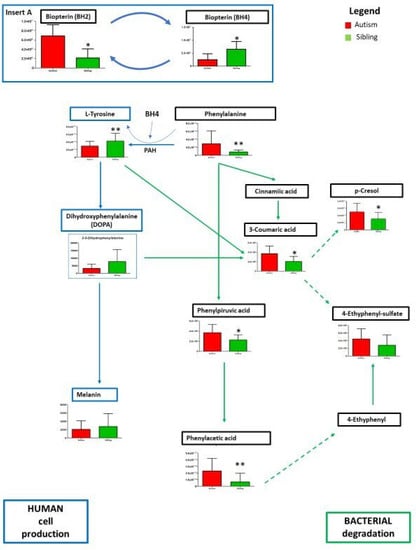 An in-depth analysis concerned the metabolism of phenylalanine due to its significant variation between paired ASD and “typically-developing siblings”. In our results (Figure 6), lower levels of tyrosine are observed in the urine of autistic children compared to matched typically-developing siblings, whereas higher contents of phenylalanine phenylethylamine, phenylpyruvic and phenylacetic acid have been found. Noticeably, decreases in tyrosine and increases in phenylalanine are paralleled by reduced levels of tetrahydrobiopterin (BH4) and increased levels of dihydrobiopterin (BH2) in ASD compared to unaffected siblings (Figure 6, insert A). BH4 is well-known to play a critical role in the conversion of phenylalanine to tyrosine (see Discussion).