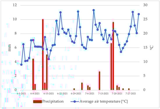 High temperatures and an almost complete absence of precipitation were recorded throughout the harvest period (Figure 2). The last rainfall of 16.0 mm was recorded in the period of 12–14 June, when the harvest started. More serious amounts of precipitation of 16.2 mm were registered in the period of 17–18 July, which coincides with the period of the end of the harvest.