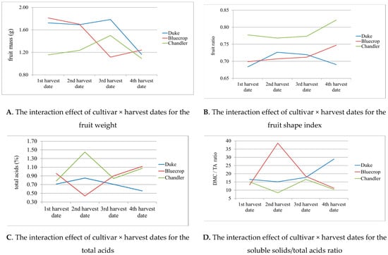 Significant interaction effect of cultivar × harvest date for fruit weight (A); fruit shape index (B); the content of total acids (C); and soluble solid/total acid ratio (D).