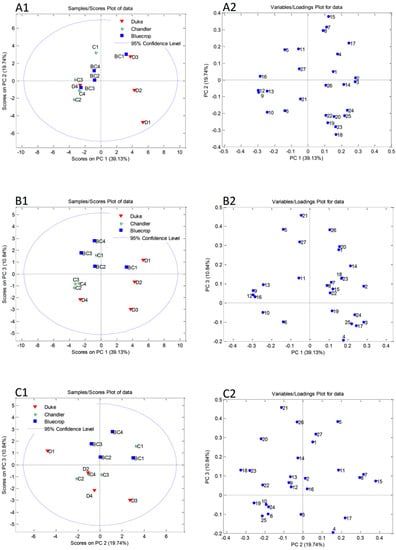 Principal component analysis (PCA) performed on chemical parameters obtained for blueberry samples: Score plots of the first three principal components (A1–C1) and loading plots (A2–C2). The number of the loading plots corresponds to the chemical properties given in Table S1.