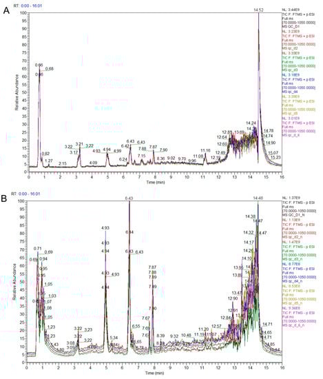 LC–MS chromatograms of the wheat grains’ metabolites (X-axis = time and Y-axis = response. (A) Relative abundance of positive ions at different time intervals. (B) Relative abundance of negative ions at different time intervals.