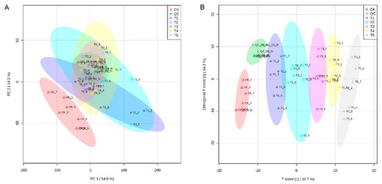 PCA and OPLS-DA of T. laevis-infected and control grains. (A) PCA of grains during different fungal hyphal growth. (B) Orthogonal partial least squares discrimination analysis (OPLS-DA) (Q = 0.938). CK stands for control, QC stands for quality control, T1 stands for suspension of teliospores, T2 stands for promycelia, T3 stands for primary basidiospores, T4 stands for H-bodies, and T5 stands for secondary basidiospores.
