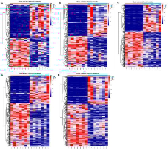 Hierarchical clustering heatmap visualizing the changes in the contents of potential metabolites in grains after different hyphal development stages in Tilletia laevis infection. (A) CK vs. T1 group. (B) CK vs. T2 group. (C) CK vs. T3 group. (D) CK vs. T4 group. (E) CK vs. T5 group. CK stands for control, QC stands for quality control, T1 stands for suspension of teliospores, T2 stands for promycelia, T3 stands for primary basidiospores, T4 stands for H-bodies, and T5 stands for secondary basidiospores.