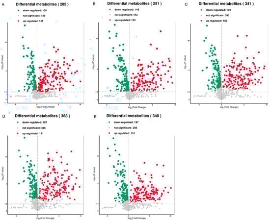 Based on OPLS-DA, metabolites were selected according to the following criteria: fold change of >2 indicating up-regulation and <0.5 indicating down-regulation of various metabolites. Metabolites with a p-value of ≤0.5 and VIP of ≥1 in each comparison were selected as significantly changed metabolites. The T1 vs. CK, T2 vs. CK, T3 vs. CK, T4 vs. CK, and T5 vs. CK relationships were visualized using volcano plots according to the log10 of the p-value (y-axis) and log2 of the fold-change (x-axis) (Figure 4A–E). In the T1 vs. CK relationship, we identified a total of 285 metabolites, out of which 130 were down-regulated and 155 were up-regulated (Figure 4A). In the T2 vs. CK relationship, 291 metabolites were identified—148 were downregulated and 143 were up-regulated (Figure 4B). In the T3 vs. CK relationship, 179 out of 341 different metabolites were down-regulated and 162 were up-regulated (Figure 4C). In the T4 vs. CK relationship, 207 out of 368 metabolites were down-regulated and 161 were up-regulated (Figure 4D). Similarly, in the T5 vs. CK relationship, 197 out of 348 metabolites were down-regulated and 151 were up-regulated (Figure 4E).