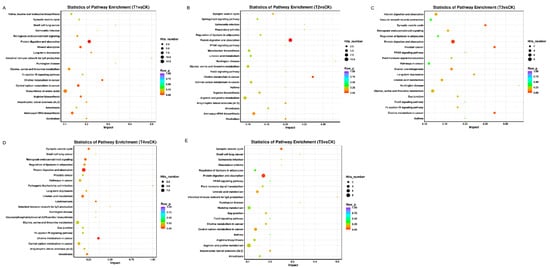 KEGG enrichment analysis scatter plot representing the pathways of DEGs in response to different fungal developmental stages of T. laevis infection. The blue, white, and red colors indicate low, medium, and high expression patterns of genes, respectively. (A) CK vs. T1 group. (B) CK vs. T2 group. (C) CK vs. T3 group. (D) CK vs. T4 group. (E) CK vs. T5 group. CK stands for control, QC stands for quality control, T1 stands for the suspension of teliospores, T2 stands for promycelia, T3 stands for primary basidiospores, T4 stands for H-bodies, and T5 stands for secondary basidiospores.