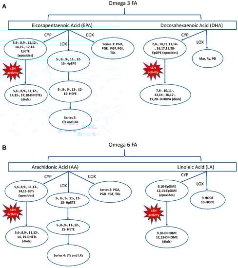 - Borsini, A.; Nicolaou, A.; Camacho-Munoz, D.; Kendall, A.C.; Di Benedetto, M.G.; Giacobbe, J.; Su, K.-P.; Pariante, C.M. Omega-3 polyunsaturated fatty acids protect against inflammation through production of LOX and CYP450 lipid mediators: Relevance for major depression and for human hippocampal neurogenesis. Mol. Psychiatry 2021, 26, 6773–6788. [Google Scholar] [CrossRef] [PubMed]
