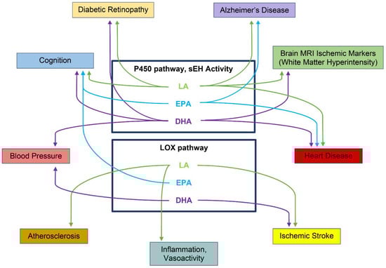 - Shinto, L.; Lahna, D.; Murchison, C.F.; Dodge, H.; Hagen, K.; David, J.; Kaye, J.; Quinn, J.F.; Wall, R.; Silbert, L.C. Oxidized Products of Omega-6 and Omega-3 Long Chain Fatty Acids Are Associated with Increased White Matter Hyperintensity and Poorer Executive Function Performance in a Cohort of Cognitively Normal Hypertensive Older Adults. J. Alzheimer’s Dis. 2020, 74, 65–77. [Google Scholar] [CrossRef] [PubMed]