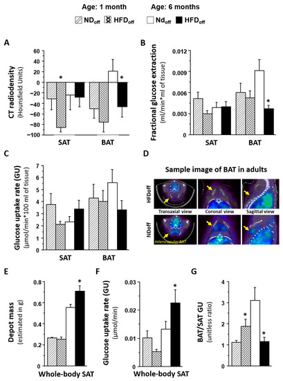 Phenotype of mice born to HFD or ND dams, including BAT and SAT lipid content (A), given by negative values in CT radiodensity, glucose metabolism (B–D) by PET imaging, features of whole-body SAT (E,F), and the metabolic balance between BAT and SAT (G), in early and adult life. The sample images in D shows interscapular BAT 18FDG levels (Bq/mL) in transaxial, coronal, and sagittal views, in two representative cases (HFDoff: fractional extraction rate constant = 0.003 mL/min, GU = 2.4 µmol/min * 100 mL; NDoff: fractional extraction rate constant = 0.013 mL/min, GU = 9.4 µmol/min * 100 mL). * p < 0.05 vs. age-matched NDoff group. NDoff = offspring born to ND dams; HFDoff = offspring born to HFD dams.