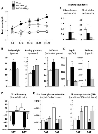 Phenotype of mice born to HFD or ND dams. The group of offspring born to HFD dams (HFDoff) is stratified according to the presence or absence of adulthood obesity (MIO, MIOR). Food intake, body weight, and metabolic and adipokine profiles are shown in (A–C); BAT and SAT lipid content and glucose metabolism are given in (D,E), and microbiota signatures are displayed in (F). * p < 0.05 vs. age-matched NDoff group. MIO-HFDoff = offspring born to HFD dams with maternally induced obesity; MIOR-HFDoff = offspring born to HFD dams but resistant to maternally induced obesity; uncl. = unclassified.