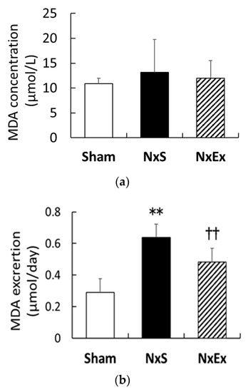 Effects of exercise training on plasma and urinary malondialdehyde (MDA). The plasma MDA concentration (a) and urinary MDA excretion (b) were compared among the sham operation (Sham), nephrectomy sedentary (NxS,), and nephrectomy exercise (NxEx) groups. Values are the means ± SEM. ** p < 0.01 compared with the sham group, †† p < 0.01 compared with the NxS group.