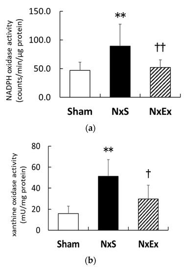 Effects of exercise training on the source of reactive oxygen species. The renal activities of nicotinamide adenine dinucleotide phosphate (NADPH) oxidase (a) and xanthine oxidase (XO) (b) were compared among the sham operation (Sham), nephrectomy sedentary (NxS), and nephrectomy exercise (NxEx) groups. Values are the means ± SEM. ** p < 0.01 compared with the Sham group, † p < 0.05, †† p < 0.01 compared with the NxS group.