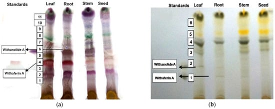 A quantitative analysis was performed on WS by Ray and Jha using TLC densitometry that revealed the high percentage of withaferin A content in leaf samples [26,27] by visualizing the spots and comparing them with the standards for withaferin A (Rf = 0.34) and withanolide A (Rf = 0.51). TLC densitometry showed the presence of withaferin A in leaves (1.6%) [28]. Quantification of withaferin A from in vitro grown samples has also been reported [29].