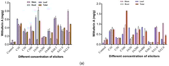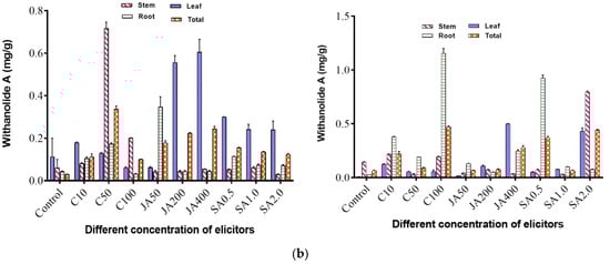 (a) Effect of elicitors, namely chitosan, jasmonic acid and salicylic acid, on withaferin A content in different tissues such as leaf, stem, and root of WS in open and controlled environments. Total is the average of three tissues (leaf, stem and root); C10, C50, C100 = concentration of chitosan at 10 ppm, 50 ppm and 100 ppm; JA 50, JA 200, JA 400 = concentration of jasmonic acid at 50 ppm, 200 ppm and 400 ppm; SA 0.5, SA 1.0, SA 2.0 = concentration of salicylic acid at 0.5 ppm, 1 ppm and 2 ppm. (b) Effect of elicitors, namely chitosan, jasmonic acid and salicylic acid, on withanolide A content in different tissues such as leaf, stem, and root of WS in open and controlled environments.
