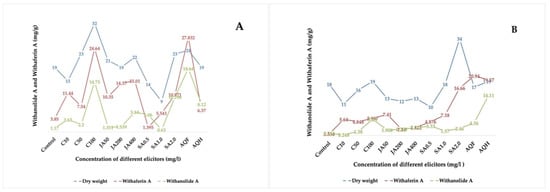 In the present study, it was found that the foliar application of elicitors not only increased the plant biomass but also resulted in increased accumulation of withanolide A and withaferin A contents (Table 3 and Figure 3). However, no correlation was observed between the production of withaferin A and withanolide A.