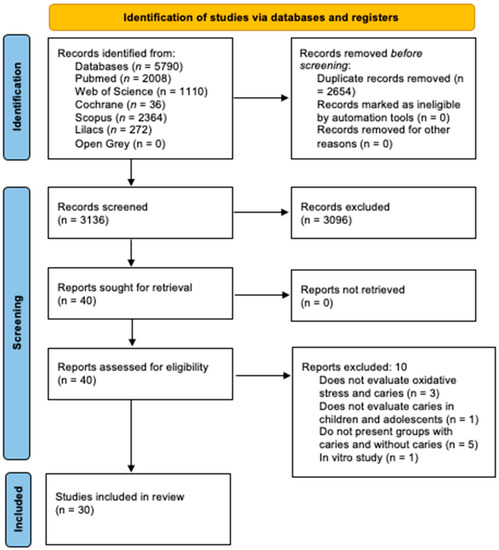 The remaining studies (n = 40) were assessed by reading the full text, and ten studies were excluded due to the following causes: three didn’t evaluate oxidative stress and caries, one didn’t evaluate caries in children and adolescents, five didn’t have caries free and caries active groups, and one is an in vitro study, conflicting with the previously established eligibility criteria. Finally, 30 studies were selected in this systematic review according to the eligibility criteria [10,13,14,15,21,22,23,24,25,26,27,28,29,30,31,32,33,34,35,36,37,38,39,40,41,42,43,44,45,46,47]. Results are presented in Figure 1.