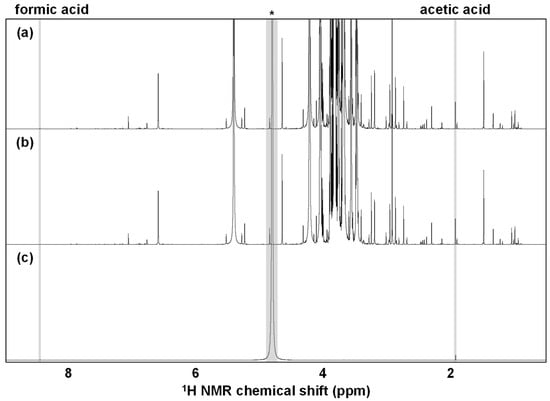 Representative 1H NMR spectra of sugarcane juice samples pretreated by filtration with filter aid (a) or centrifugation (b). Contaminants from the filter or filter aid in the filtration process could also be observed on the NMR spectrum with no sugarcane juice sample (c). *, solvent: water.