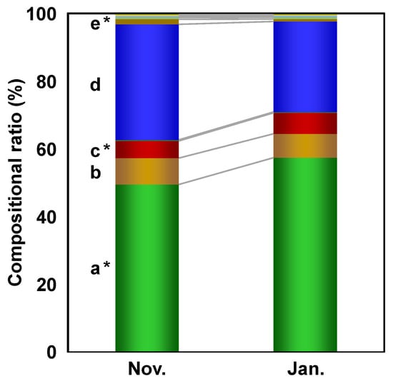 The SVM classification model construction was accompanied by the calculation of important variables contributing to the discrimination of the harvest periods. The calculation was performed by the mean decrease accuracy method described in a previous study [18]. The calculation results identified several compounds, such as trans-aconitic acid, threonine, alanine, and galactose, as characteristic metabolites in discriminating the differences between the harvest periods (Figure 5). The compositional balances of the top 10 metabolites identified by the analysis of importance were different between the sugarcane juice samples harvested in November and January (Figure 6). In particular, the compositional ratio of trans-aconitic acid was likely to be relatively high in January compared to that in November, whereas the same ratio of alanine was likely to be relatively low.