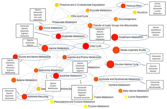 Metabolites described in this review and the impacted pathways. The metabolites identified as altered in NDs (in black rectangles) participate in several metabolic pathways, with a major impact on pathways highlighted with a blue circle. The grey lines represent the connections between different pathways. Figure designed using MetaboAnalyst 5.0 [214].