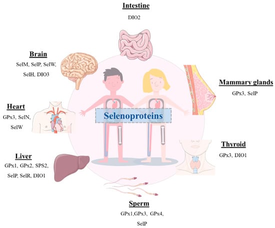 Schematic representation of the presence of several selenoproteins in different organs of the human body.