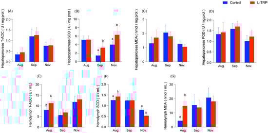 Hou M, Pang Y, Niu C, Zhang D, Zhang Y, Liu Z, Song Y, Shi A, Chen Q, Zhang J, et al. Effects of Dietary L-TRP on Immunity, Antioxidant Capacity and Intestinal Microbiota of the Chinese Mitten Crab (Eriocheir Sinensis) in Pond Culture. Metabolites. 2023; 13(1):1. https://doi.org/10.3390/metabo13010001