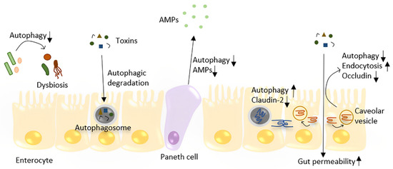 Figure 2. The role of autophagy in the maintenance of gut homeostasis. Autophagy plays a role in the defense against toxins and bacteria by directly degrading them in enterocytes. Autophagy regulates the TJ barrier through two different pathways: by degrading pore-forming claudin-2 and preventing occludin endocytosis, which prevents increased gut permeability. Depleting autophagy in the gut leads to dysbiosis. In Paneth cells, decreased autophagy may lead to less AMP production and Paneth cell apoptosis.