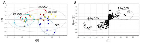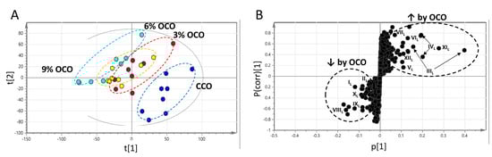 Influences of feeding oxidized corn oil (OCO) on hepatic metabolome. Data from LC-MS analysis of liver extractions were processed by PLS-DA modeling. (A) Scores plot of the PLS-DA model on liver samples. (B) S-plot of the OPLS-DA model on liver samples. The OCO-responsive metabolites are labeled (IL–XIIL).
