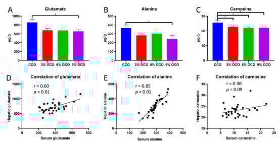 Concentrations of oxidized corn oil (OCO)-responsive amino acids in the liver and their correlations with serum concentrations. Hepatic concentrations of glutamate (A), alanine (B), and carnosine (C). Value = mean ± SEM (n = 8 pigs/group). * p < 0.05 from one-way ANOVA followed by the Tukey post hoc test between control corn oil (CCO) and OCO treatments. The correlations between hepatic and serum concentrations of glutamate (D), alanine (E), and carnosine (F) and their significances were calculated by Pearson correlation analysis.