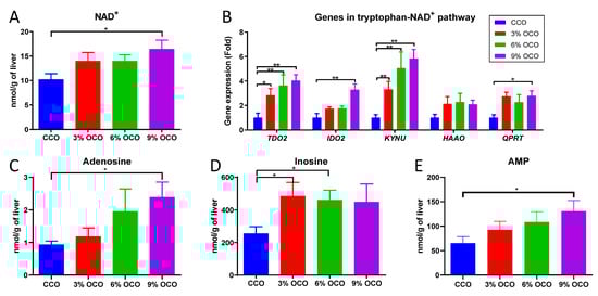 Quantification of NAD+ in the liver confirmed that it was increased in a dose-dependent manner by feeding OCO (Figure 4A), which is in contrast with the decrease in serum tryptophan (Table 1), the precursor of the nicotinamide moiety in NAD+ from the kynurenine pathway of tryptophan metabolism. The transcriptional levels of the enzymes in the kynurenine pathway were also determined, and results showed that dietary OCO increased the expression levels of TDO2, IDO2, KYNU, and QPRT genes in a dose-dependent manner (Figure 4B). In addition, the metabolites related to the adenine dinucleotide moiety of NAD+, including adenosine, inosine, and AMP, were also increased by feeding OCO (Figure 4C–E).