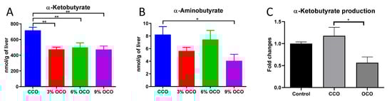 Effects of dietary concentrations of oxidized corn oil (OCO) on the hepatic metabolites of threonine catabolism. (A) Concentrations of α-ketobutyrate. (B) Concentrations of α-aminobutyrate. (C) Production of α-ketobutyrate after the in vitro incubation of pig liver homogenate with the polar extracts of control corn oil (CCO) and OCO. The extraction solution was used as the control. The production rate of α-ketobutyrate in the control was artificially set as 1, and the production rates in the coincubation of CCO and OCO extracts with pig liver homogenate samples were expressed as the fold of changes compared to the control. Value = mean ± SEM (n = 3 replicates per reaction). * p < 0.05 and ** p < 0.01 from one-way ANOVA followed by the Tukey post hoc test between the CCO and OCO dietary treatments.