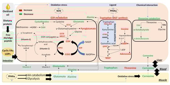 Summary of oxidized corn oil (OCO)-elicited metabolic changes in amino acid metabolism. The activation of tryptophan-NAD+ biosynthesis, the expansion of glutathione metabolism, and the inhibition of threonine catabolism, in the liver, as well as the decreases in glucogenic amino acids (alanine and glutamate) in serum and liver, were identified as the most prominent changes in amino acid metabolism after dietary OCO consumption. These selective changes were likely mediated by PPARα activation, oxidative stress, and Nrf2-mediated antioxidant responses in the liver and muscle. Many of these metabolic events may possess protective functions and might contribute to the tolerance of nursery pigs to the exposure of oxidized lipids.