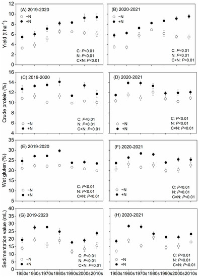 Yields and quality of wheat cultivars from different release years under −N and +N treatments from 2019–2020 (A,C,E,G) and 2020–2021 (B,D,F,H).