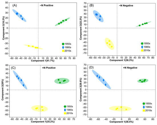 Partial least-squares–discriminant analysis (PLS-DA) of leaf metabolic profiles of different years of released cultivar under −N (A,B) or +N (C,D) treatments. Positive and negative modes are shown.