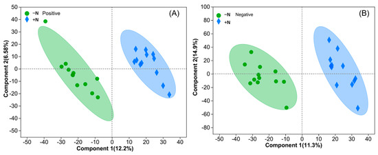 Partial least-squares–discriminant analysis (PLS-DA) of leaf metabolic profiles between the +N and −N treatments: positive (A) and negative (B) modes.