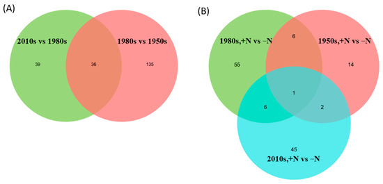 Distinct from genetic improvements, the application of N fertilizer regulated fewer metabolites. We identified 23 altered metabolites (16 upregulated and 7 downregulated) for the 1950s cultivar, 68 (20 upregulated and 48 downregulated) for the 1980s cultivar, and 54 (18 upregulated and 36 downregulated) for the 2010s cultivar (Table 2). The main types of regulated metabolites for the +N vs. −N groups for the 1950s cultivar included phenylpropanoids and polyketides (30.00%), organoheterocyclic compounds (25.00%), lipids and lipid-like molecules (20.00%), and organic acids and derivatives (10.00%). The primary types of regulated metabolites for the +N vs. −N groups for the 1980s cultivar were organic acids and derivatives (33.9%), lipids and lipid-like molecules (32.20%), organic acids and derivatives (15.25%), and organoheterocyclic compounds (11.86%). The main types of regulated metabolites for the +N vs. vs. −N group in the 2010s cultivar were lipids and lipid-like molecules (44.90%), phenylpropanoids and polyketides (20.41%), organic oxygen compounds (14.29%), and organic acids and derivatives (10.20%). We identified only one shared differential metabolite (5′-carboxy-gamma-chromanol) between the above three N treatment groups (Figure 4B; Tables S3–S5).