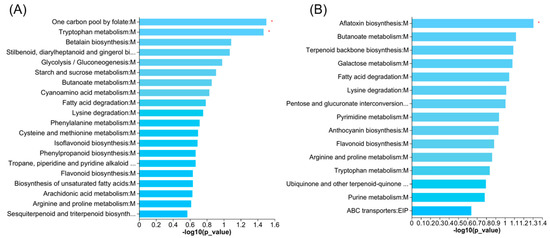 KEGG enrichment maps of different metabolites in 1980s vs. 1950s groups (A) and 2010s vs. 1980s groups (B). * indicate enrichment with significance at 0.05 level.