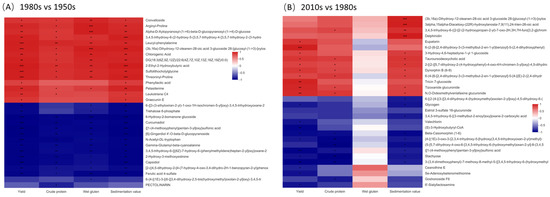 Correlation between metabolics and grain yield and quality in 1980s vs. 1950s groups (A) and 2010s vs. 1980s groups (B). *, ** and *** indicate the correlation is significant at 0.05, 0.01 and 0.001 levels, respectively.