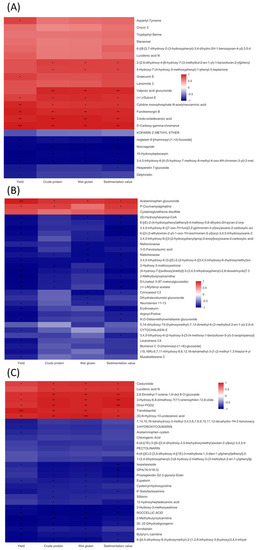 Correlation between metabolics and grain yield and quality in the +N vs. −N groups of 1950s (A), 1980s (B), and 2010s (C) cultivars. *, ** and *** indicate the correlation is significant at 0.05, 0.01 and 0.001 levels, respectively.