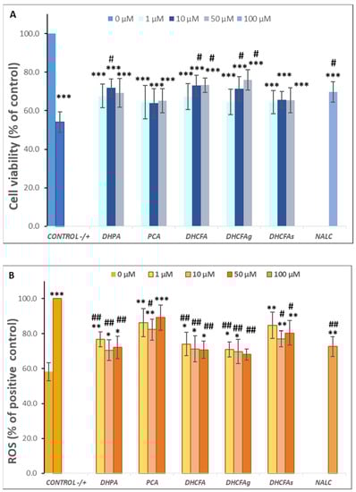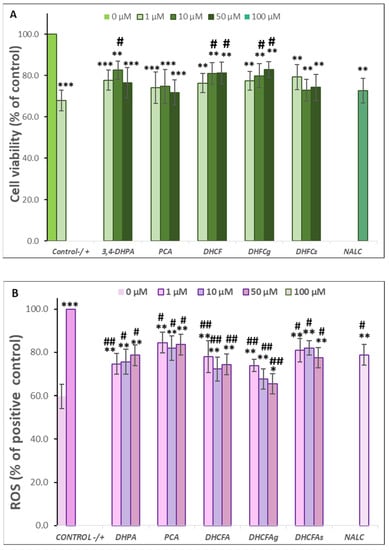 3.2.2. Activity under tBHP-Induced Cell Oxidation: Cell Viability and ROS Accumulation