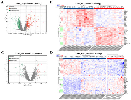 Identification of DEGs. DEGs were screened out from NASH_BS (A) and NASH_Diet (C) subgroups. The top 20 total significant upregulated and downregulated DEGs were mapped with gene profiles from NASH_BS (B) and NASH_Diet (D) subgroups.