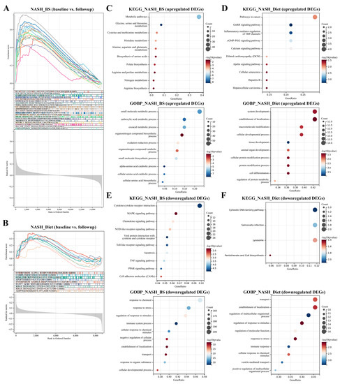 Function enrichment. Hallmark enrichment analyses were conducted in the NASH_BS and NASH_Diet subgroups. (A) 20 significant hallmark terms were shown with enrichment scores (ES) in NASH_BS subgroup (FDR adjusted p < 0.05). (B) 9 top-ranked (but not significant) hallmark terms were shown in the NASH_Diet subgroup (FDR adjusted p > 0.05). KEGG and GO enrichment analyses were conducted in NASH_BS and NASH_Diet subgroups. Top significant KEGG and GO terms from upregulated and downregulated gene clusters were respectively displayed (C–F) (p < 0.05).